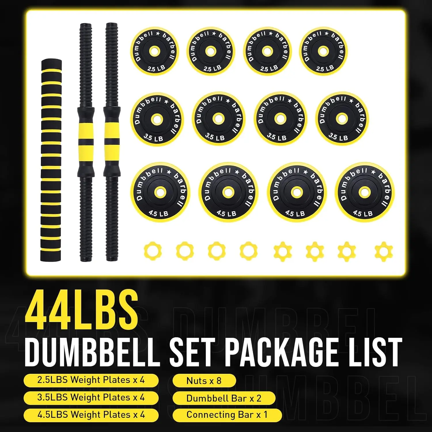 44 LBS Dumbbell SET PACKAGE LIST: 4 x 4.5 LB Dumbbell Weight Plate, 4 x 3.5 LB Dumbbell Weight Plate, 4 x 2.5 LB Dumbbell Weight Plate, 2 x Dumbbell Bars, 1 x Connecting Bar, 8 x Nuts. Any questions about the adjustable dumbbell set, please feel free to contact us.
