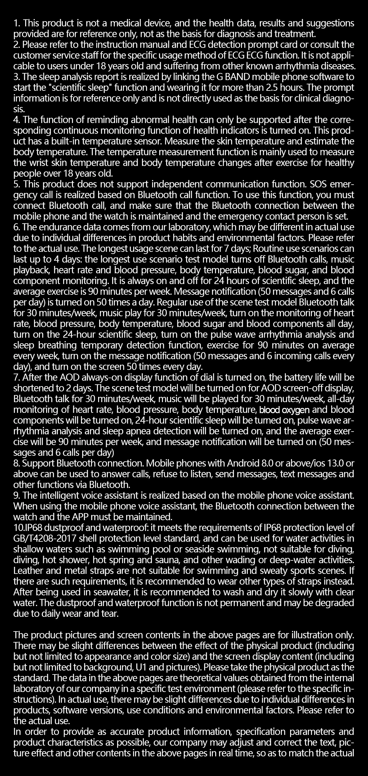 Bluetooth call, ECG electrocardiogram, micro-physical examination function, HRV detection, emotion detection, fatigue detection, non-invasive monitoring, blood component measurement (uric acid and blood lipid function), body fat BMI measurement, MET function, SOS emergency call function, blood oxygen monitoring , blood pressure monitoring, breathing training, women's health (menstrual tracking), heart rate monitoring, sleep monitoring, sedentary reminder, etc.