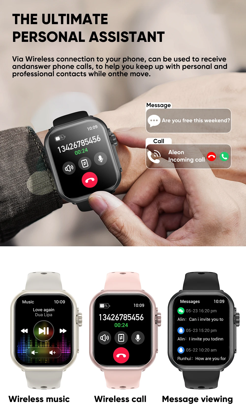 More features: OTA, step monitoring, calorie monitoring, voice assistant, gaming, Bluetooth music playback, music control, more than 100 sports modes, weather forecast, stopwatch, flashlight, power saving mode, do not disturb mode, sports recording, multi-dial, custom dial, female cycle, timer, find phone/find watch, 1506 high-definition sound quality.