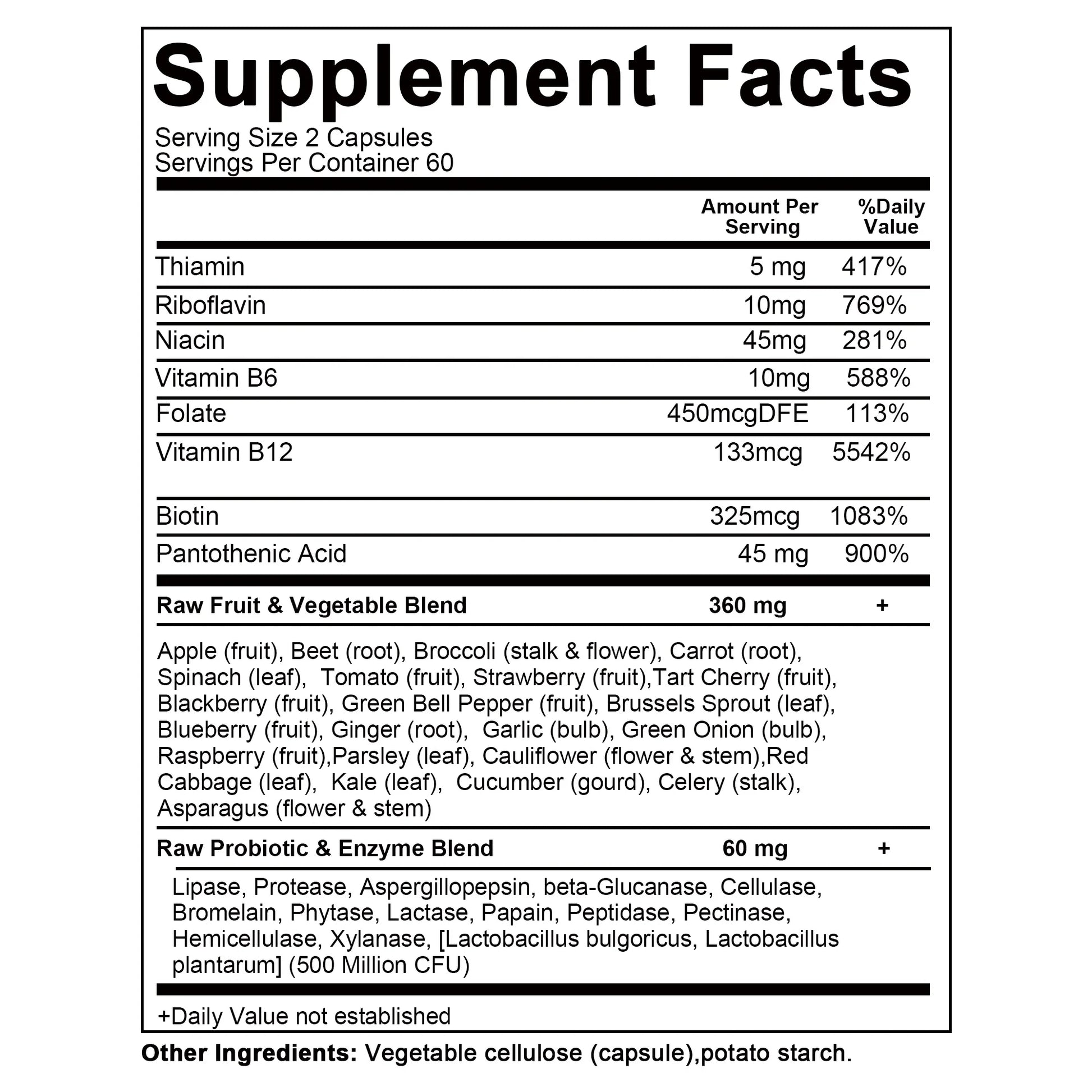 ENERGY BOOST: Boost energy and support metabolism and stress response with B-complex containing vitamins B1, B2, B3, B5, B6, B12, folate and biotin.