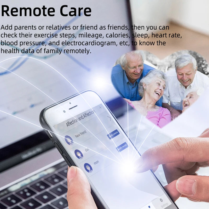 Remote care for family and friends. Multiple exercise modes. Exercise measurement. Reminder for prolonged sitting