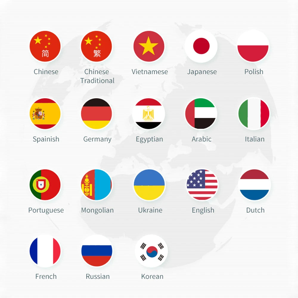 Supports 23 global mainstream languages such as Chinese, English, Russian, French, German, Spanish, Portuguese, Japanese, Korean, Arabic, etc. easy to switch without worrying about language barriers.