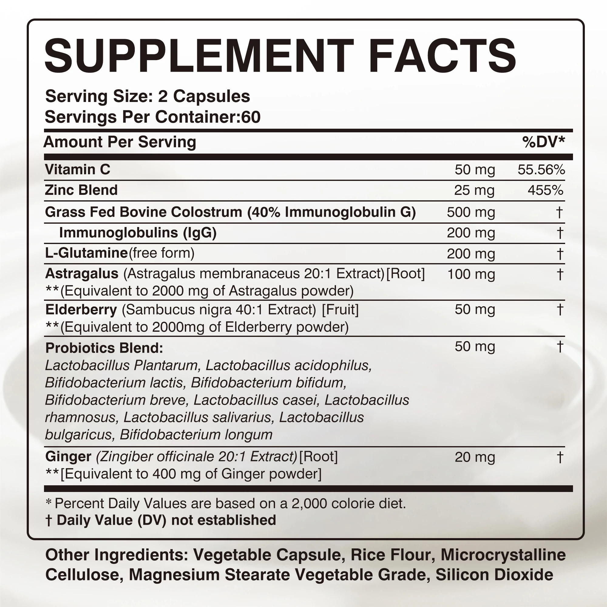 Ingredients: Grass-Fed Colostrum, Immunoglobulins, L-Glutamine, Probiotic Blend