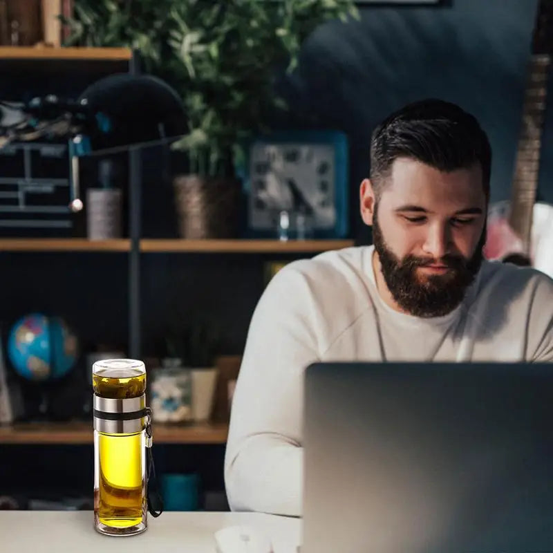 1.Double Wall: Quench your thirst with any beverage of your choice, be it hot coffee or cold water, in our Glass Tea Infuser Bottle. The heat-resistant double-walled glass ensures safety while making it your perfect companion for all your drinks.