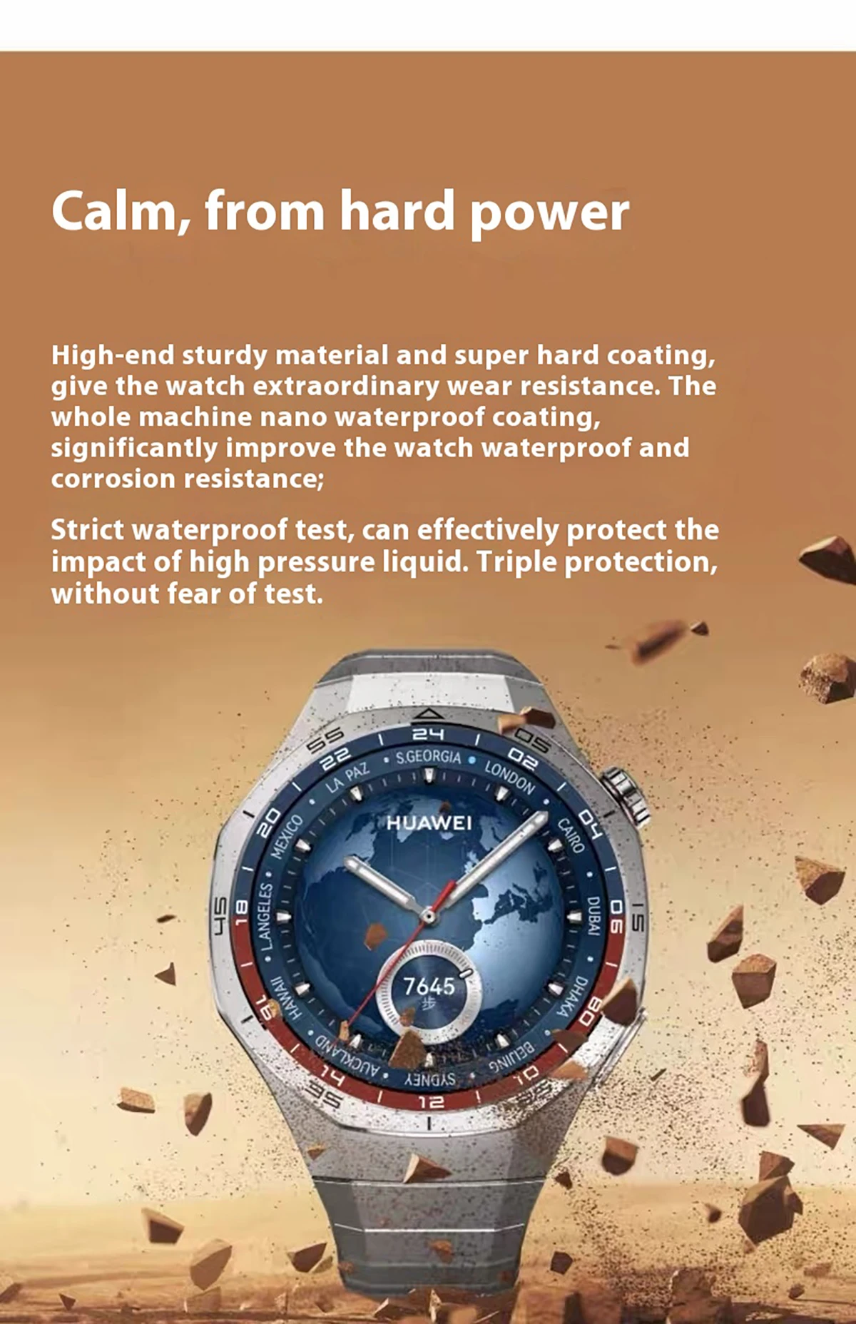 * It conforms to the rated water resistance of 5 ATM under ISO 22810:2010 standard, which means that the equipment can withstand the hydrostatic pressure of up to 50 meters for 10 minutes, but it does not mean that the product is water-resistant under the water depth of 50 meters.