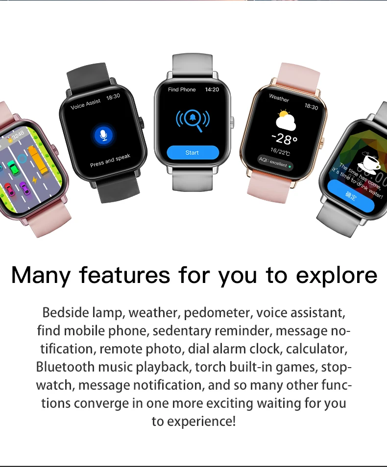 Bluetooth call, AI voice assistant, watch dialing, watch address book, music playback, stopwatch, timer, music control, remote photo, weather, screen brightness adjustment, APP Sports track, alarm reminder, call reminder, SMS reminder, sedentary reminder, heart rate monitoring, heart rate timer monitoring, blood pressure monitoring, blood pressure timer monitoring, blood oxygen monitoring, blood oxygen timer monitoring, sleep monitoring, breathing training, Spirit Island, cover hand resting screen, resting screen pointer, bedside lamp, step count, distance, calories, hand raising, wrist lifting, multiple exercise programs