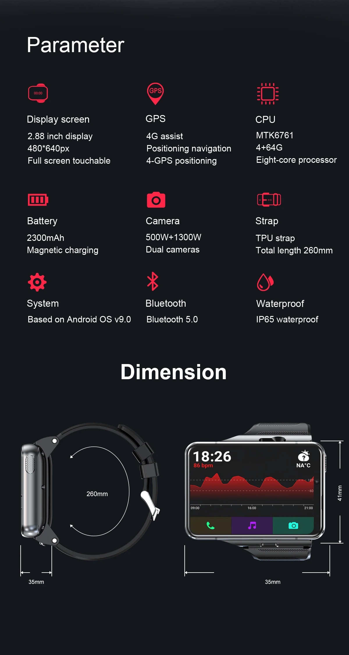 New S999 4G Smart Watch Android 9.0 MTK6761 Quad Core 4GB 64GB 2.88" HD Large Screen Smartwatch 5.0MP+13.0MP Dual Camera 2300mAh
