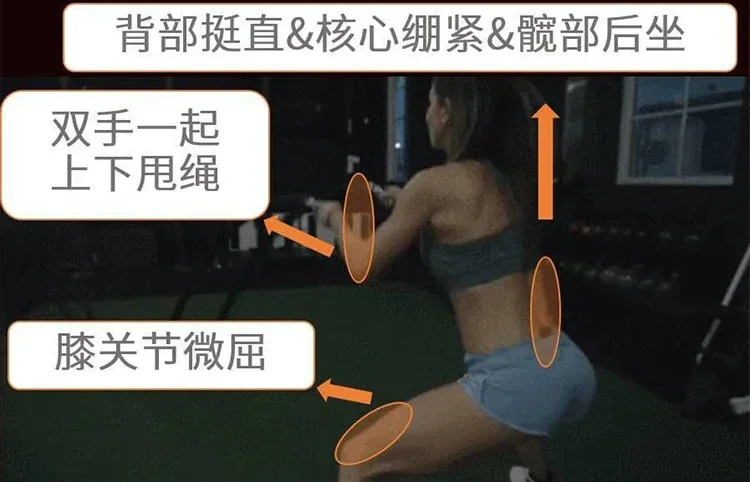 Back straight & core tight & hips back sitting, hands together up and down rope, knee slightly bent