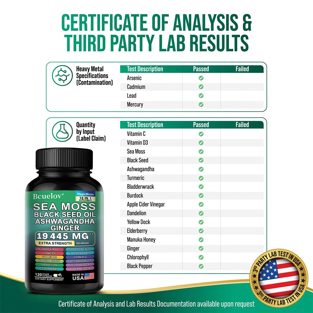 Natural Ingredients - Formulated with natural ingredients that benefit personal health, our Sea Moss supplement is made with 100% pure wild caught Sea Moss and Red Algae to deliver powerful bioavailable nutrients without any fillers or synthetic ingredients, featuring the immune boosting properties of Nigella Sativa Seed Oil, the adaptogenic properties of Ashwagandha, and the rich mineral content of Irish Sea Moss and Bladderwrack.