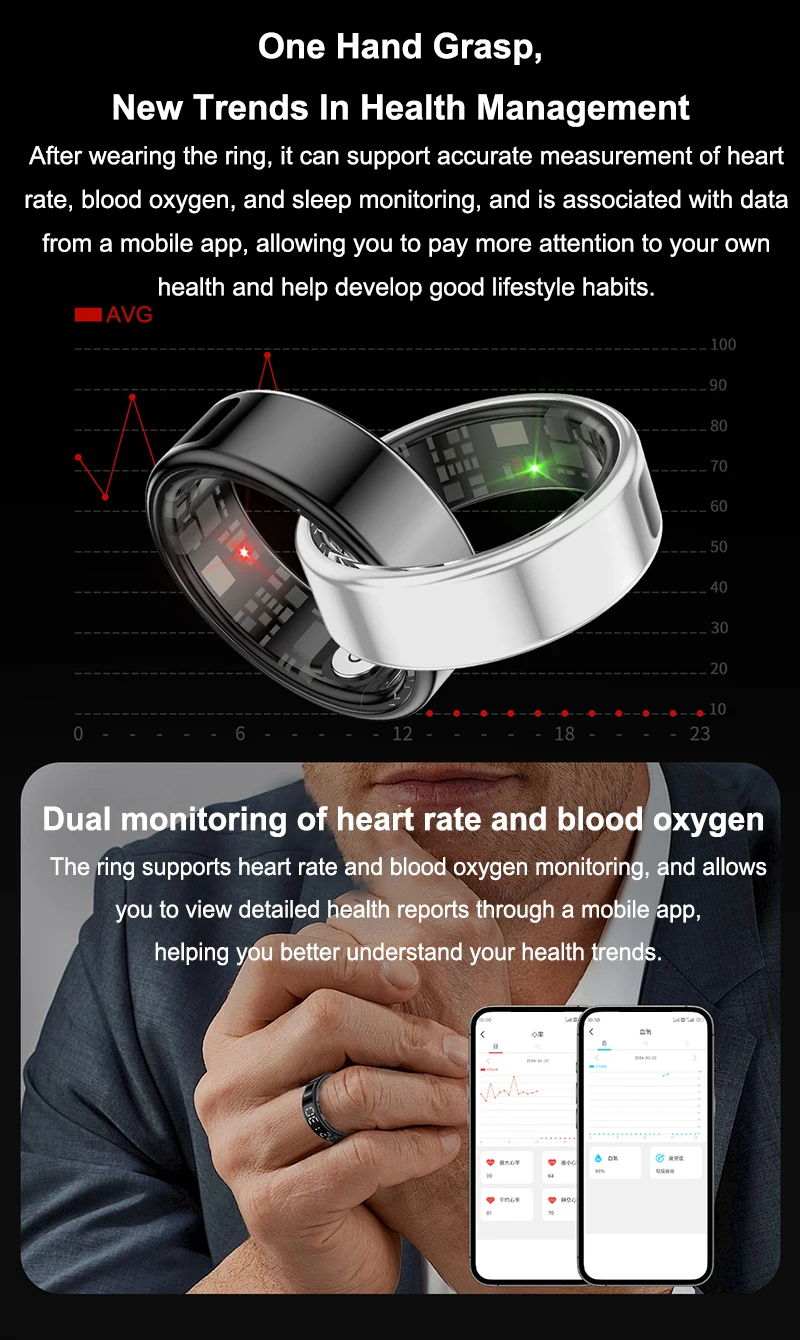 * Multi-function: supports mountaineering, cycling, running and other sports modes, and can monitor the heart rate duration, pace and number of steps in real time to help you explore a bigger world and expand your boundaries. After wearing the ring, it can support accurate measurement of heart rate, blood oxygen and sleep monitoring, and associate data with the mobile phone APP, so that you can pay more attention to your health and help develop good living habits.
