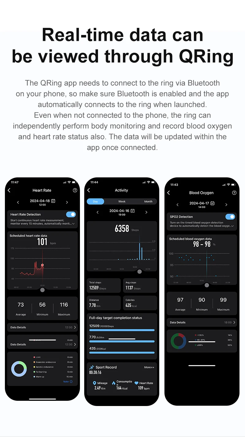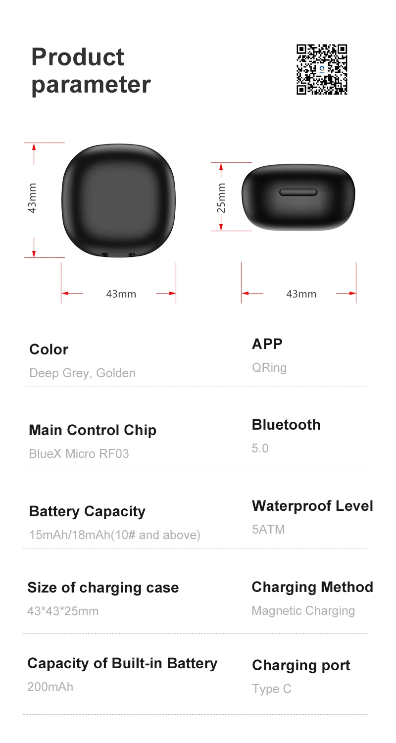 3. How to start: Charge the Ring with the included charging cable. The heart rate light will light up to indicate successful startup. Then you can use the APP Qring to connect the Ring.