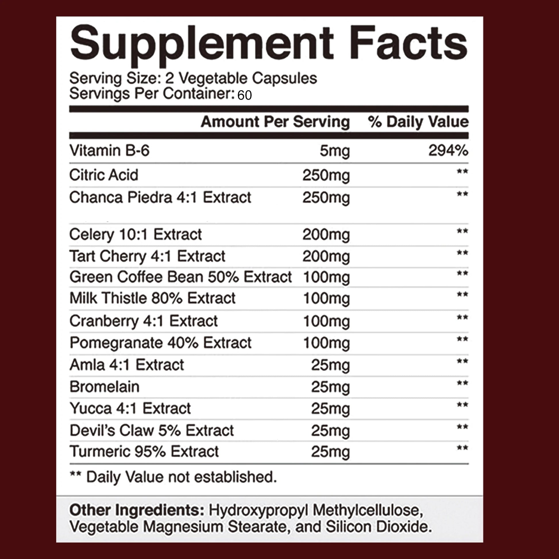Healthy Kidney Support Supplement - Take advantage of our daily uric acid supplement containing chanca piedra, which is known to promote kidney health and function by balancing uric acid levels.
