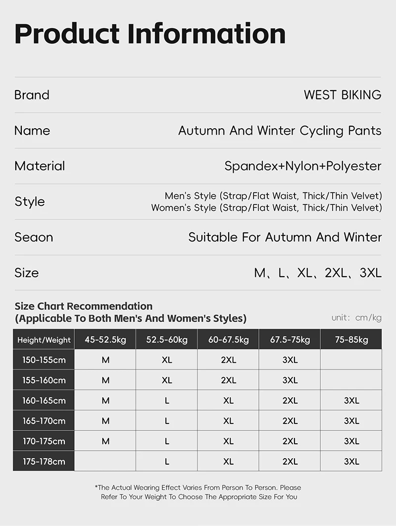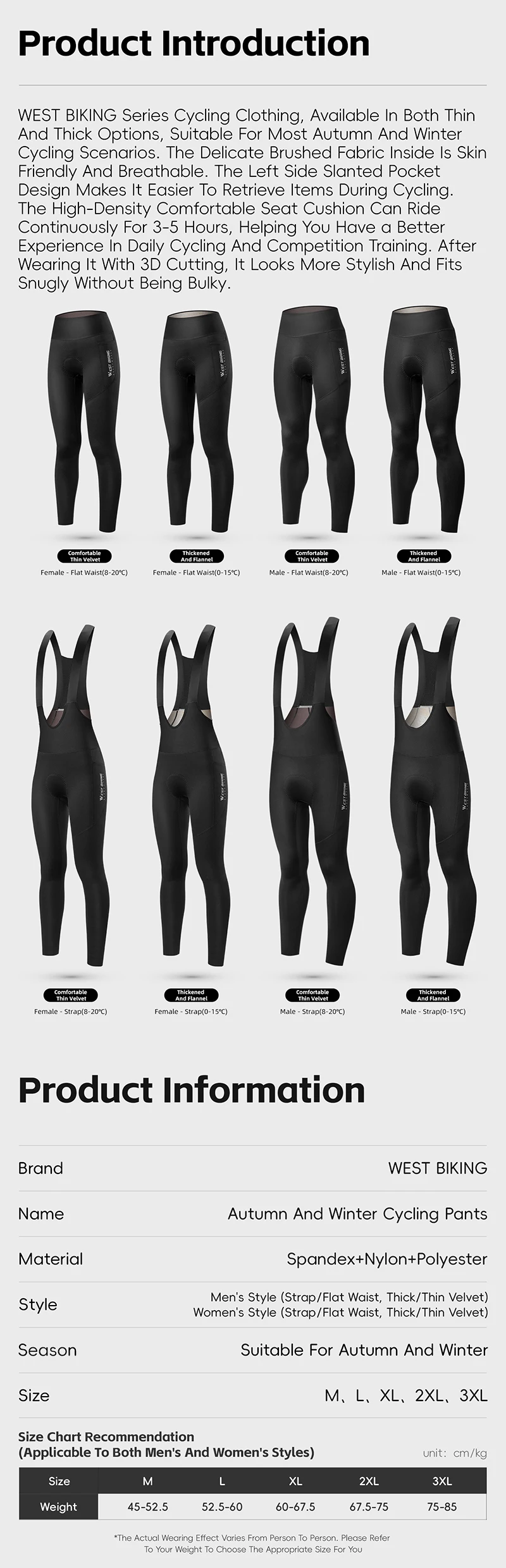 WEST BIKING Series Cycling Clothing,Available In Both ThinAnd Thick Options, Suitable For Most Autumn And Winter Cycling Scenarios. The Delicate Brushed Fabric Inside ls Skin Friendly And Breathable.The Left Side Slanted Pocket Design Makes lt Easier To Retrieve ltems During Cycling.The High-Density Comfortable Seat Cushion Can Ride Continuously For 3-5 Hours,Helping You Have a Better Experience in Daily Cycling And Competition Training. After Wearing It With 3D Cutting, It Looks More Stylish And Fits Snugly Without Being Bulky.