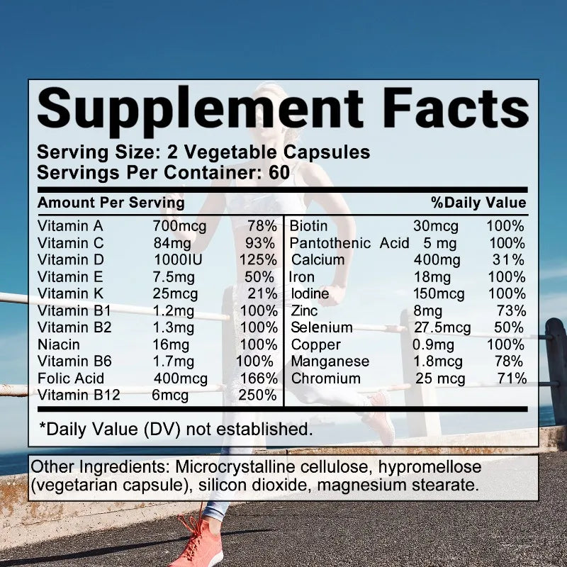 Providing energy support, this women's multivitamin contains key ingredients that support free radicals: Vitamins A C E D K B1 B2 B3 B5 B6 B12 Magnesium, Biotin, Calcium, Zinc, and support a healthy body.