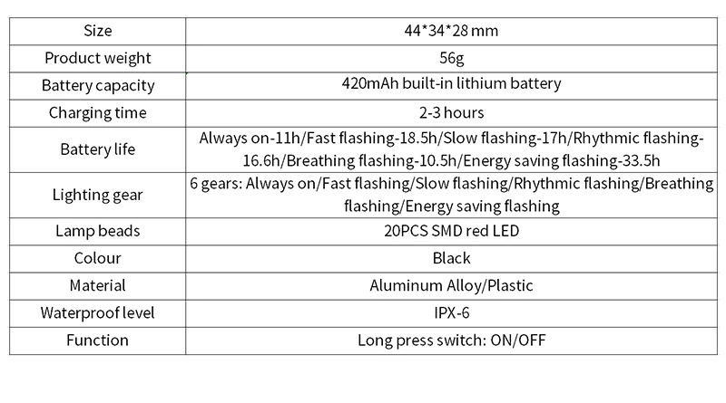 Fashion:6 Modes - Always on/Fast flashing/Slow flashing/Rhythmic flashing/Breathing flashing/Energy saving flashing