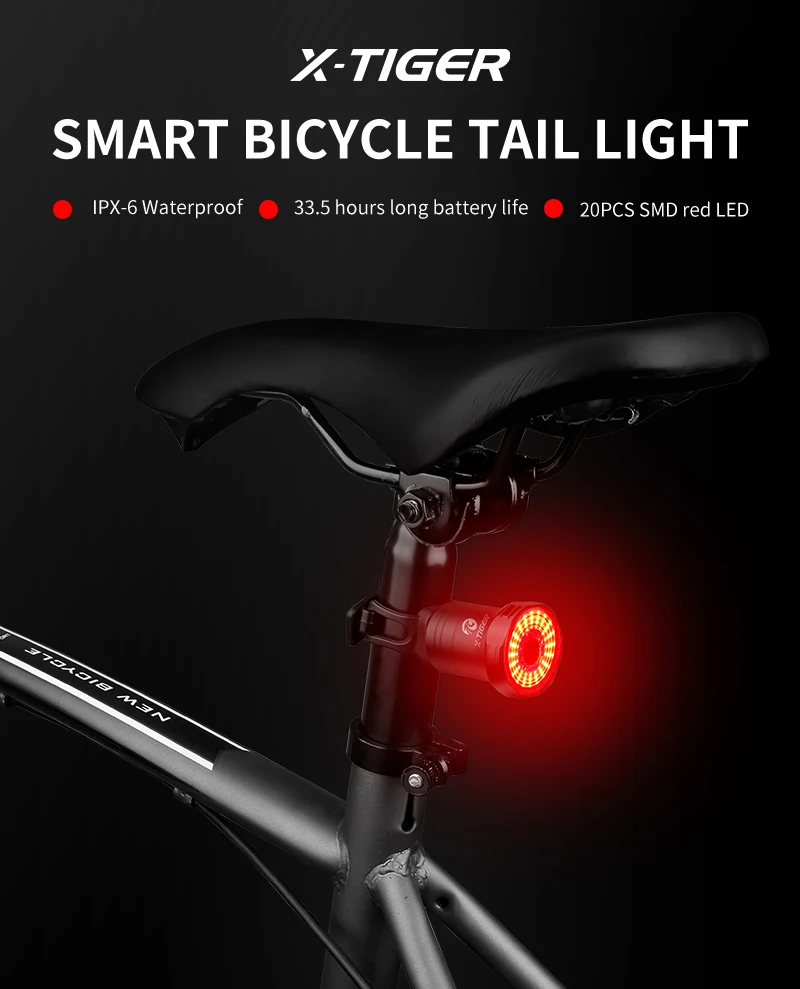 X-TIGER Bike Rear Light Smart Brake Sensing Light Bicycle Tail Light IPX6 Waterproof LED Charging Taillight Cycling Accessories