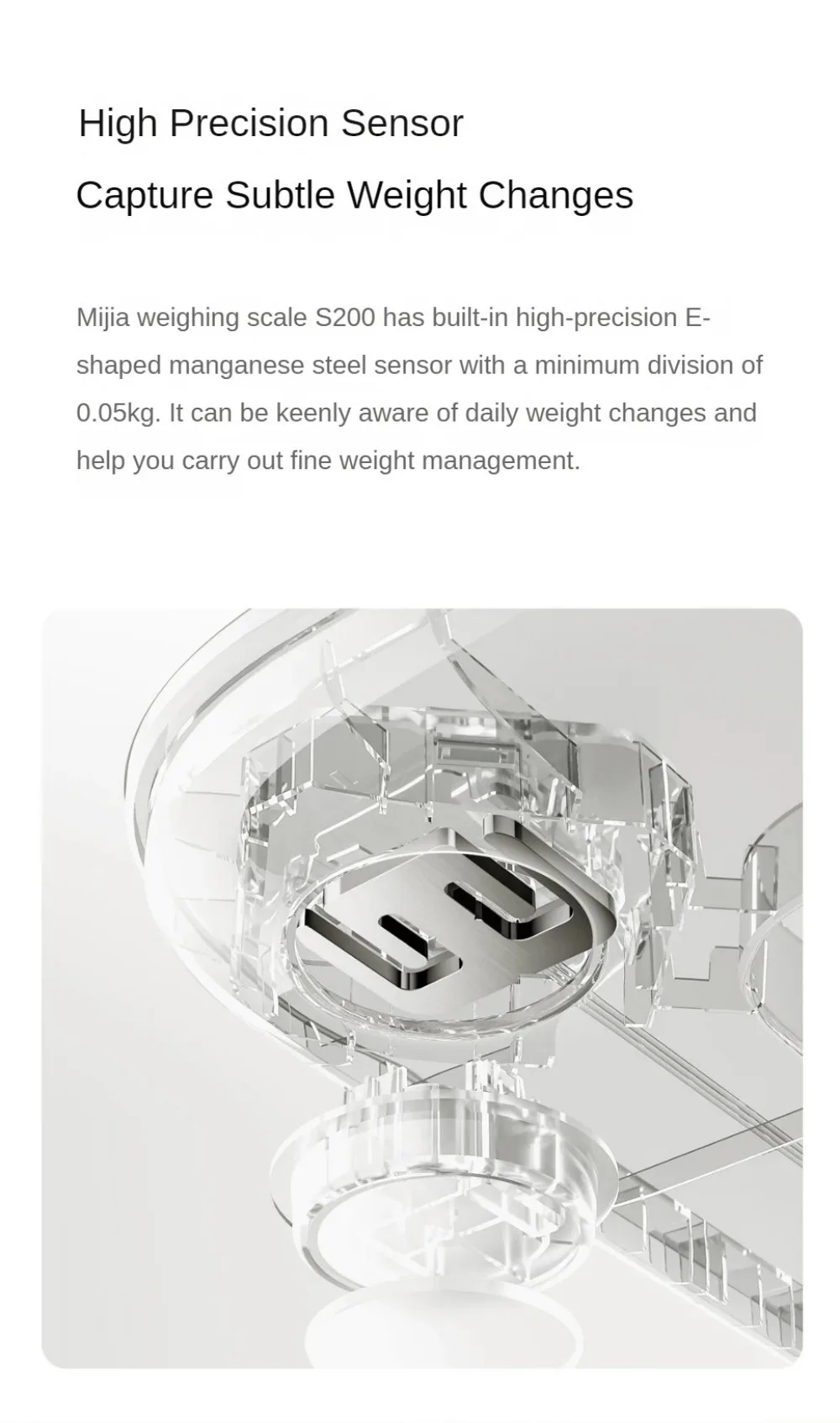The Mijia Weight Scale S200 is equipped with a high-precision E-shaped manganese steel sensor, with a minimum division of 0.05kg. It can sensitively perceive daily weight changes, helping you achieve refined weight management.