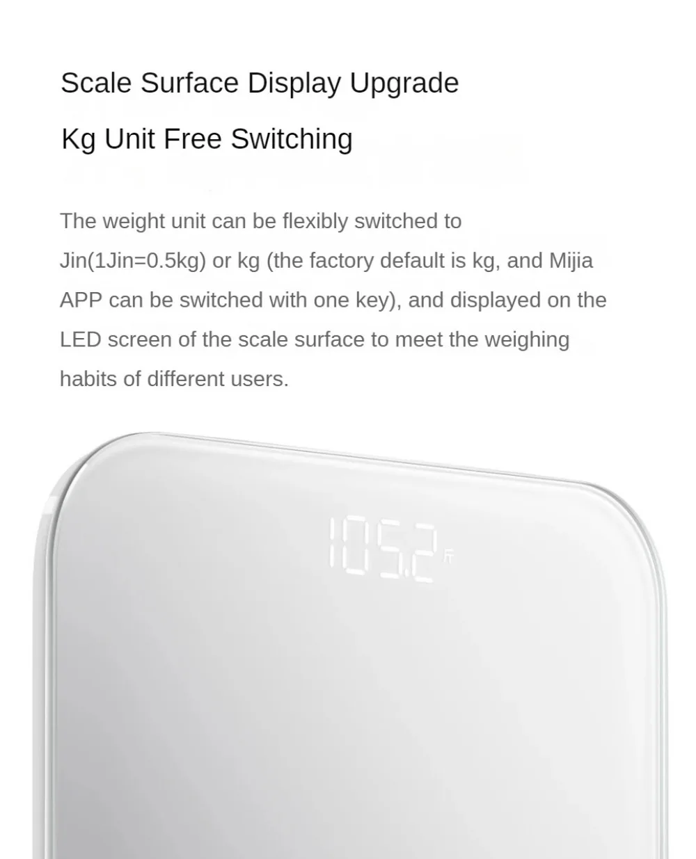 The weight unit can be flexibly switched to g or kg (default to kg at the factory, one click switch on the Mi Home APP), and displayed on the LED screen of the scale to meet the weighing habits of different users.