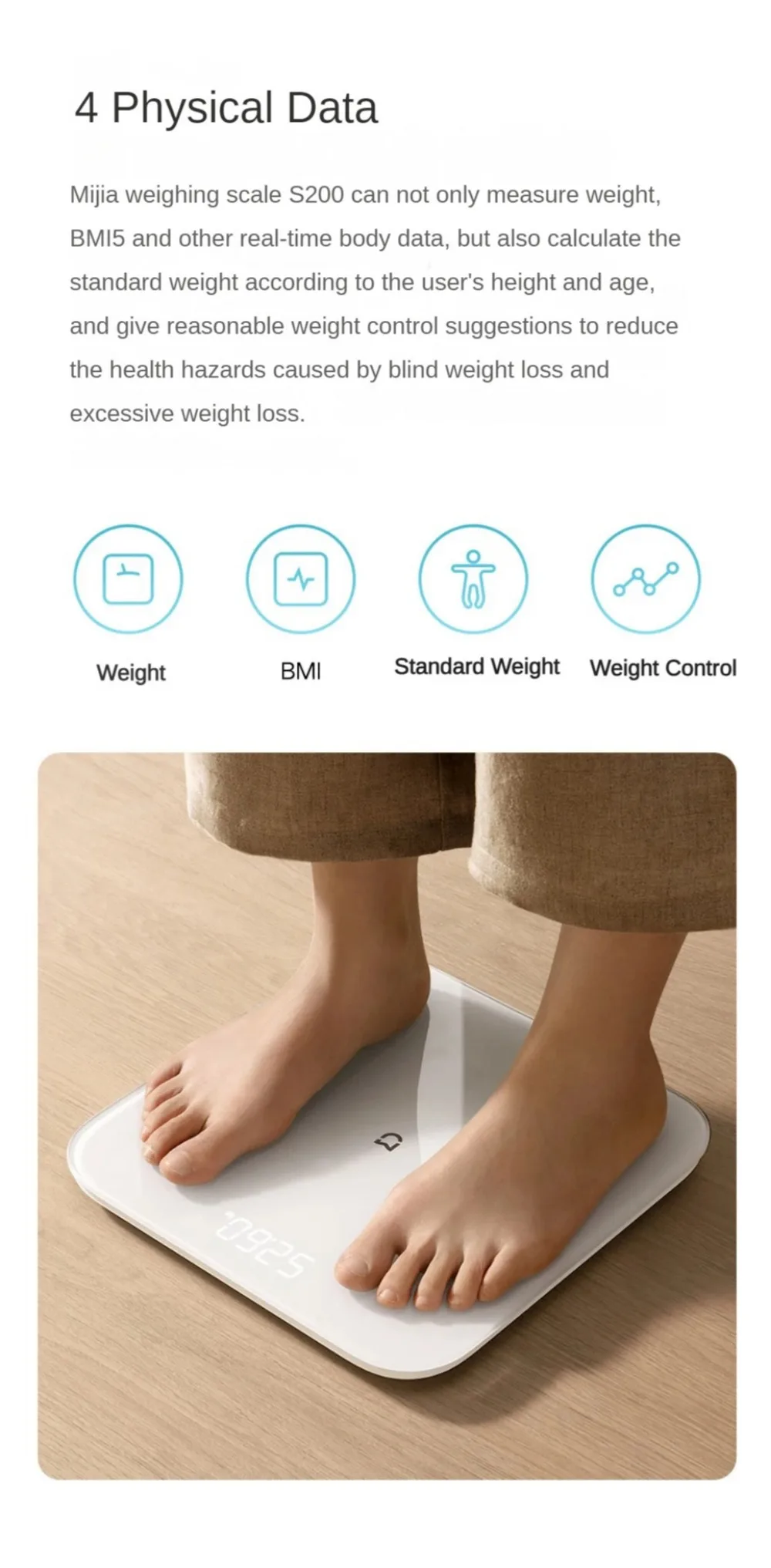 The Mi family weight scale S200 can not only measure weight, but also Real time body data such as BMI will also calculate the standard weight based on the user's height and age, and provide reasonable weight control suggestions to reduce the health hazards caused by blind weight loss and excessive weight loss.
