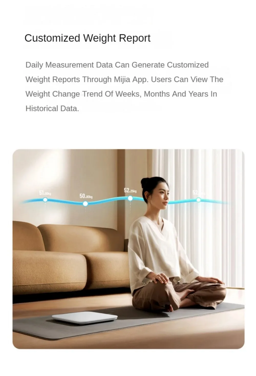 7. Daily measurement data through Mijia APP, can produce customized weight report, users can view weekly, monthly and yearly weight change trend in historical data.